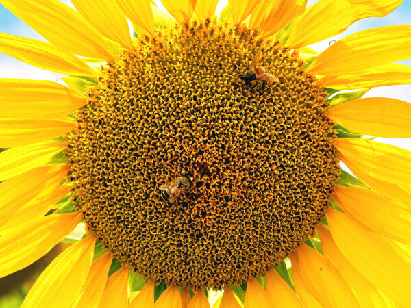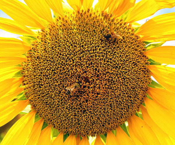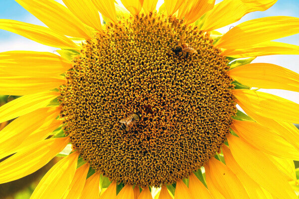 I was driving around the Tuscan countryside, south of Florence, Italy, and I came across a seemingly endless field of Sunflowers. After shooting from up on the hill, I decided to change my viewpoint to up close and personal. The bees were buzzing all around me and near macro perspective of a single sunflower became a choice shot of bees at work.